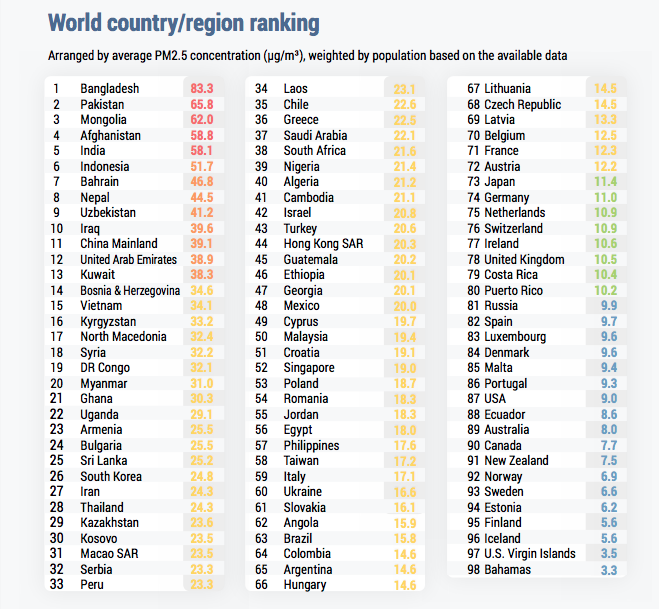 El estudio, presentado por Frank Hammes, director general de IQAir, aporta un ranking de las ciudades con el peor aire del globo y pone de relieve la elevada contaminación por partículas en suspensión de menos de 2,5 micras (PM2,5) ) en todo el mundo durante el año 2019. Estos elevados niveles de contaminación atmosférica están vinculados, en especial, a fenómenos provocados por el cambio climático, como las tormentas de arena y los incendios forestales, y a la contaminación generada por la rápida urbanización de las ciudades en regiones como el sudeste de Asia.