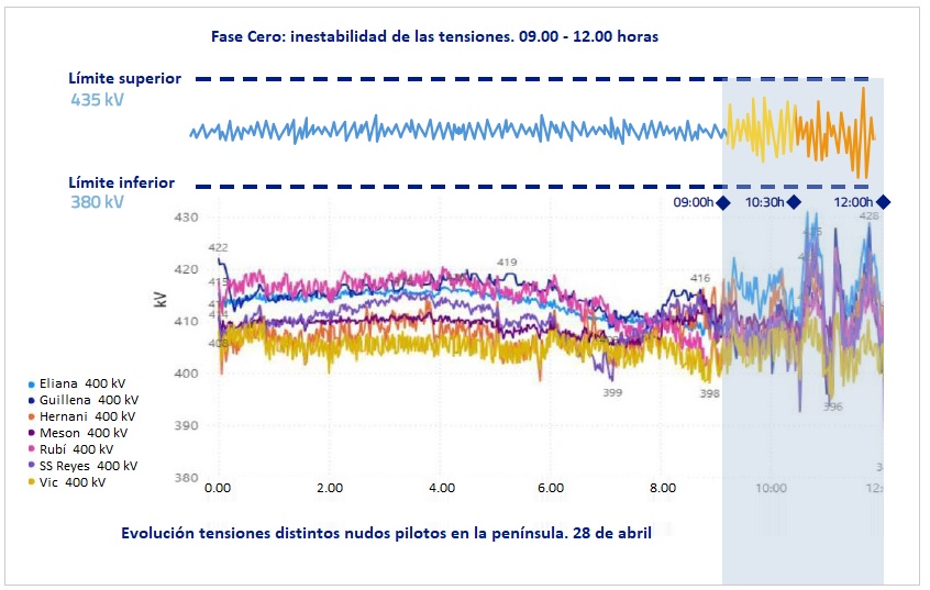 A partir de las diez y media, vemos que la amplitud, esa inestabilidad de la tensión, esas subidas y bajadas de tensión, son mayores, más agudas. Se nos ha informado de que durante esa mañana se produjeron distintas llamadas desde los distintos centros de control localizados en el territorio, distintas empresas, al centro de control de REE advirtiendo de estas variaciones de tensión.