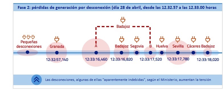 A las 12.32.57 dispara [se desconecta] una infraestructura de evacuación en Granada. Esta desconexión de generación vuelve a producir un aumento de tensiones. Diecinueve segundos más tarde se produce una segunda desconexión. En este caso, en dos fases, en Badajoz, también en una infraestructura de evacuación, esa infraestructura desconecta a la vez otras dos instalaciones de generación, en Badajoz y en Segovia.