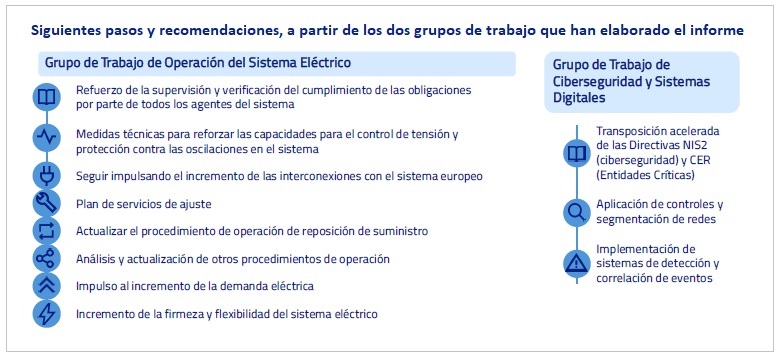 En primer lugar, se concluye que no existe evidencia de ciberincidencia o ciberataque como causa de la crisis energética, ni en el operador ni en distintos niveles. Sí se han identificado vulnerabilidades, carencias, malas configuraciones de medidas de seguridad que sí pueden exponer las redes a potenciales riesgos futuros, con lo cual este grupo va a aprovechar este contexto para emitir recomendaciones. Lo más importante es esto: identificar los riesgos e identificar las posibles herramientas y medidas.