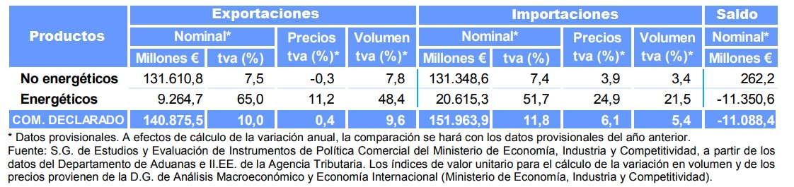 El peso que las importaciones de productos energéticos tienen en la economía española es brutal. Si sumamos todas las exportaciones de todos los productos (todos, menos los energéticos) y sumamos todas las importaciones de todos los productos (todos, menos los energéticos) veremos que España tiene superávit: 262 millones de euros. O sea, que, durante este semestre, hemos vendido al exterior más que lo que hemos comprado. Ahora bien, si incluimos en ese balance los productos energéticos, el superávit se disuelve como un azucarillo minúsculo en un barreño de café caliente. Porque el déficit energético es brutal: 11.350 millones de euros (M€). Porque compramos mucho más petróleo y gas (mucho más) que el que vendemos.