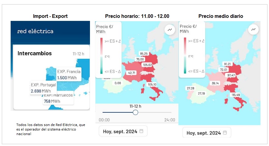Pero es que, además de generar mucha, mucha electricidad renovable, y además de ofertar energía eléctrica a un precio muy, muy bajo, España está ahora mismo exportando. Según los datos de Red Eléctrica (REE), desde el sur de Pirineos a mediodía se está exportando 1.500 megavatios hora a Francia, 2.698 megavatios hora a Portugal y 758 megavatios hora a Marruecos. Exportaciones que lógicamente en muy gran medida son de electricidad limpia, pues (también a estas horas, y también según la misma fuente, REE) más del 70% de la electricidad que está siendo generada en estos momentos es de origen renovable (de ese total casi la mitad es solar).