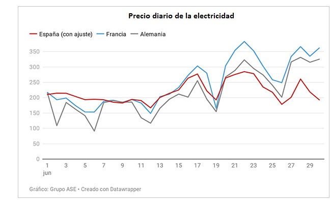 El equipo de analistas de Grupo ASE destaca que, entre el 15 y el 30 de junio, el precio francés se ha elevado un 63,77%, hasta los 303,56 €/MWh y que el alemán lo ha hecho un 57%, hasta los 262,45 €/MWh. En cambio -matizan los expertos-, en España (con ajuste) solo ha subido un 20,1%, hasta los 236,93 €/MWh. "Si en España se hubiera incrementado, como en Francia y Alemania, entre un 57-60%, el precio eléctrico -concluye ASE- hubiera alcanzado los 310-320 €/MW", es decir, hubiera sido un 30% mayor al que finalmente ha resultado con el ajuste incluido. La evolución del precio de la electricidad en España (incorporado el ajuste para compensación) ha sido alcista -reconocen los analistas-, pero esa evolución "se ha situado muy por debajo del precio en Francia y Alemania". Así, "la interpretación de que la medida no está rebajando el precio no es correcta", concluye ASE.