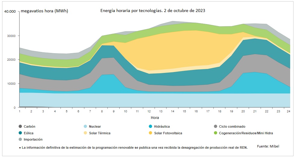 [Bajo estas líneas, producción de electricidad estimada para el día de hoy, previsión a partir de la cual se construye el precio del mercado diario de electricidad. Las horas más "solares", las de las horas centrales del día, aquellas en las que la generación solar es mayor, coinciden con las horas más baratas].