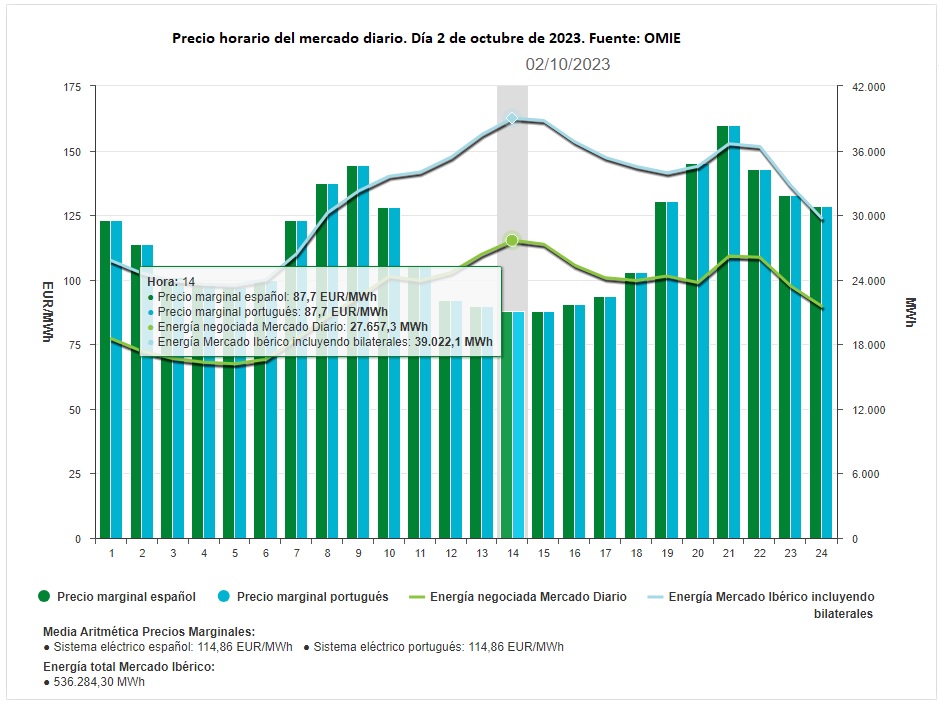 El precio promedio de la luz para los clientes de tarifa regulada vinculados al mercado mayorista sube este lunes, 2 de octubre, casi veinte puntos con respecto a este domingo (+19,65%). Lo hace hasta alcanzar (precio promedio del día) los 114,86 euros por megavatio hora (MWh). Por franjas horarias, el precio máximo, que se eleva hasta los 160,07 euros/MWh, se registrará entre las 20.00 y las 21.00 horas, mientras que el precio mínimo se dará entre las 13.00 y las 14.00 horas, con 87,7 euros/MWh, según los datos provisionales del Operador del Mercado Ibérico de Energía (OMIE) recogidos por Europa Press. Septiembre ha cerrado este fin de semana con una media de 103,3 euros/MWh, frente a los 141,07 euros/MWh que registró el mercado mayorista (también conocido como pool) en septiembre de 2022, haciendo de este mes el más caro desde febrero de 2023.
