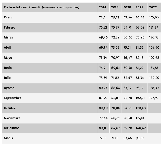 En septiembre de 2021, el precio del kWh de electricidad se situó en una media de 20,51 céntimos en horario valle, 20,54 en llano y 31,09 en punta (con el 15,62% de impuestos indirectos incluidos). Este septiembre, el precio medio ha sido de 33,12 céntimos en horario valle, 32,56 en llano y 38,45 en punta (incluido el 5,525% de impuestos indirectos que se aplican en las facturas emitidas desde el pasado 1 de julio). La media aritmética entre los tres tramos ha sido este mes de 34,71 céntimos, un 36,8% más que los 25,38 de hace un año, según señalan desde la organización. La media ponderada tomando como referencia el consumo del usuario medio en cada tramo ha sido de 34,51 céntimos, un 40,2% más elevada que los 24,62 de septiembre de 2021.