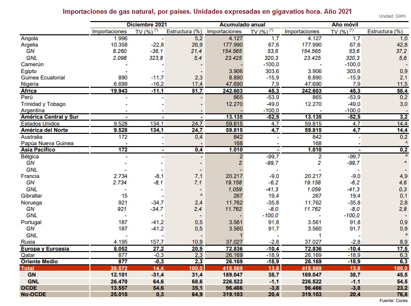 Todo el petróleo (el 100%) y todo el gas (el 100%) que quemamos para producir electricidad, calor de hogar o movimiento (coches, camiones, aviones... transporte) se traduce en eso (electricidad, calor o transporte), pero también se traduce en emisiones de gases de efecto invernadero. Por eso son muchos los analistas que apuestan por la electrificación de la demanda. Porque cuantos más usos electrifiquemos (calefacción, coche eléctrico), menos dependencia energética padeceremos y menos CO2 producirá el país, un país en el que el 40% de la electricidad ya es verde, no produce gases de efecto invernadero, es decir, un país que ya ha demostrado que es posible sustituir combustibles fósiles por energías renovables. [Bajo estas líneas, detalle de dos tablas publicadas por el Ministerio de Industria, Comercio y Turismo en sendos informes: Informe Mensual de Comercio Exterior Diciembre 2019, e Informe Mensual de Comercio Exterior Diciembre 2021]
