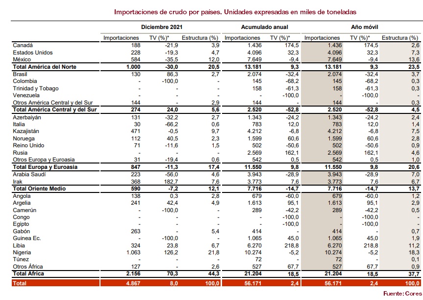 Con el petróleo ha sucedido lo mismo. En 2019, la economía española importó algo más de 66 millones de toneladas de crudo, según Cores. Para ello, el país hubo de pagar una factura de 35.000 millones de euros. Pues bien, en 2021, las importaciones de crudo han sido mucho menores (56 millones de toneladas), pero la factura se nos ha ido a 33.695 millones de euros. Importamos pues un 15% menos de crudo (-15%), pero la factura no ha caído ni mucho menos en la misma medida (-3,7%).