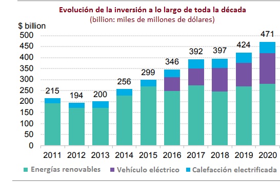 Las inversiones en la transición energética tal como se define por BNEF abarca la financiación para: activos renovables, tales como proyectos eólicos o solares a escala comercial y capacidad solar distribuida; infraestructura y vehículos de carreteras de energía limpia, incluyendo vehículos eléctricos, y tecnologías de calefacción electrificadas.