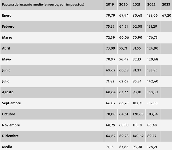 El enero que ya termina ha sido el enero con la factura de la luz más baja en 13 años, según Facua-Consumidores en Acción y su análisis sobre la evolución de la tarifa semirregulada (PVPC). El recibo del usuario medio ha experimentado una bajada interanual del 49,5% este mes. Así, un usuario con una potencia contratada de 4,4 kilovatios (kW) y un consumo de 366 kilovatios hora (kWh) mensuales pagará un recibo de 67,20 euros, frente a los 133,06 euros de hace un año. Si se compara ahora con el recibo del pasado diciembre, cuando estuvo en 89,82 euros, la bajada mensual ha sido del 25,2%. Para encontrar un enero con una factura más baja hay que remontarse a 2010, cuando se situó en 61,78 euros. Asimismo, es la primera vez que el recibo del usuario medio se pone por debajo de los 70 euros desde febrero de 2021.