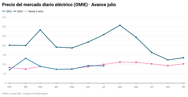 El precio diario del mercado mayorista (POOL) español en la primera quincena de julio se sitúa en 91,77 euros por megavatio hora (€/MWh). Esto supone una bajada de un 1,3% respecto al mes de junio y un fuerte descenso del 64,4% respecto a hace un año. Sin embargo, por primera vez desde febrero de 2022, se sitúa diez puntos por encima de la media europea (+10,6%). Según el análisis de cada mes del Grupo ASE, el precio eléctrico español está siendo estable durante la primera parte del mes. Los días laborables el precio medio diario se ha movido entre 100-110 €/MWh y ha caído los fines de semana. Con respecto a las horas de máxima radiación (de 10 a 18h), el precio de la primera quincena de julio es de 65,67 €/MWh, frente a los 73,55 euros de junio.