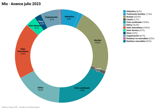 Por su parte, la generación en España cae un 9 % en la primera parte de julio por la reducción de la demanda (- 3,1%) pero, sobre todo, por la reducción del saldo exportador de España, del 79,6% respecto al mismo periodo del año pasado. La desaparición del tope del precio del gas y el aumento de la producción nuclear francesa (+27%) han provocado que el saldo con Francia haya pasado de exportador a importador. En los primeros 16 días de julio las importaciones desde Francia se han incrementado en 800 TWh, cuando el año pasado en estas fechas apenas eran de 51 TWh. Por su parte, las exportaciones se han reducido a 291 TWh, frente a los 796 TWh del año pasado. Además, los ciclos combinados de gas (CCG) han reducido su aportación en un 37,9%. Sin embargo, ocupan la segunda posición en mix, con una participación del 19,6%, solo por detrás de la nuclear (22,9%). Esta fuerte presencia de los CCG en todas las horas del día, especialmente en las punta, ha provocado que el precio de la electricidad no haya caído más.