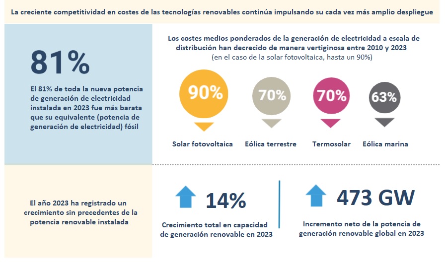 Las energías renovables siguen ganando competitividad a pesar de que los precios de los combustibles fósiles vuelven a relajarse, concluye el informe Costos de generación de energías renovables en 2023, publicado por la Agencia Internacional de Energías Renovables y presentado hoy en la Cumbre Mundial de Renovables, en el marco de la Asamblea General de las Naciones Unidas. De los 473 gigavatios (GW) añadidos en 2023, el 81% (382 GW) de los nuevos proyectos industriales de energías renovables -concreta el informe- tenían costos inferiores a los de las alternativas basadas en combustibles fósiles. El nuevo informe de la Agencia Internacional de las Energías Renovables (Irena, según sus siglas inglesas) destaca que, "tras décadas de descenso de los costos y de mejoras tecnológicas, sobre todo en energía solar y eólica, las ventajas socioeconómicas y medioambientales del despliegue de energías renovables ahora resultan especialmente convincentes".