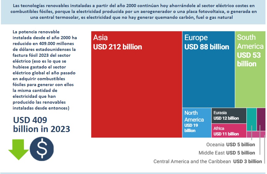 En ese sentido el informe concreta un dato, también espectacular: según las estimaciones de Irena, la potencia renovable instalada desde el año 2000 ha propiciado el ahorro en combustibles fósiles (solo en el año 2023) de 409.000 millones de dólares estadounidenses.