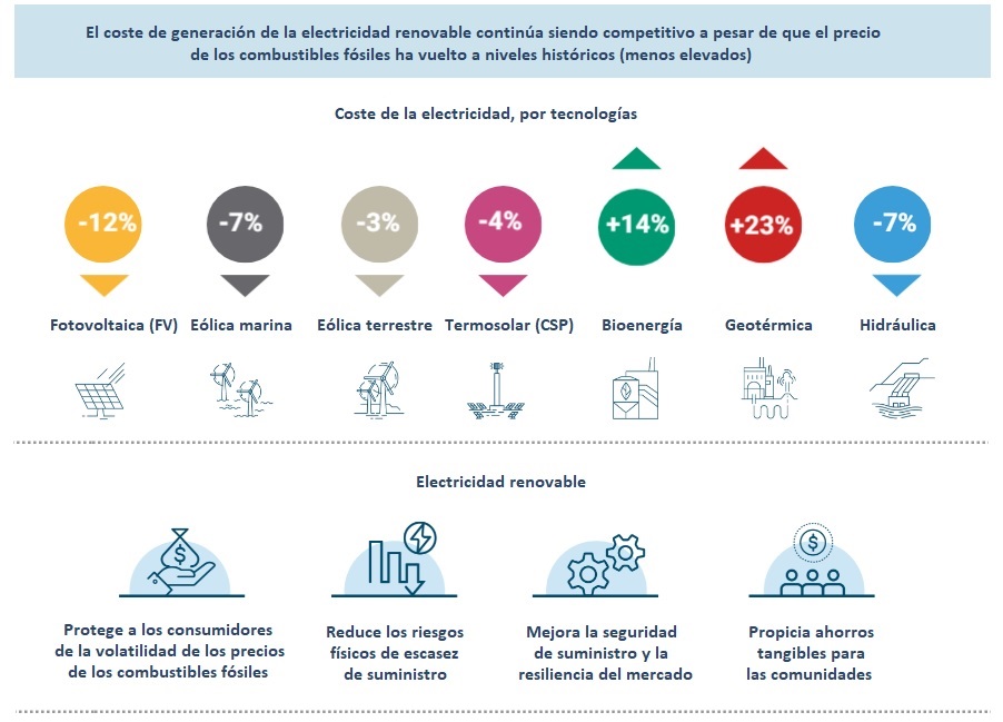 En 2023, el costo medio global ponderado de la electricidad procedente de nuevos proyectos renovables para la mayoría de tecnologías se redujo en los siguientes porcentajes: un 12% en energía solar fotovoltaica; un 3% en energía eólica de tierra adentro; un 7% en energía eólica marina; un 4% en energía solar de concentración (CSP) y un 7% en energía hidroeléctrica.