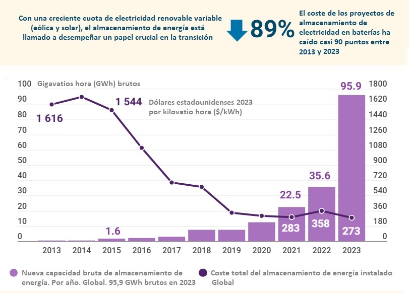 Y el informe ahí arroja otro dato impactante: "los costos de los proyectos de almacenamiento en baterías se han desplomado un 89% entre 2010 y 2023, lo que ha facilitado la integración de elevadas proporciones de capacidad solar y eólica al dar una respuesta a los desafíos en materia de infraestructura de red".