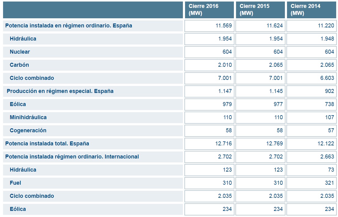 Naturgy se está desembarazando pues del diésel y el carbón como fuentes de electricidad y está reajustando, a la luz de "los principales indicadores del sector energético", el valor de las demás fuentes contaminantes de electricidad: su parque generador de carbón, gas y nuclear. En su lugar, la compañía ha anunciado que quiere invertir hasta 8.400 millones de euros durante el periodo 2018-2022, "de los que 5.300 millones se dedicarán a crecimiento, con especial énfasis en los negocios de Gas y Electricidad (36%), así como en Infraestructuras Latinoamérica (27%), entre otras regiones". O sea, que la transición de Naturgy pasa por el gas (eso sí, allende las fronteras, pues el parque de generación de electricidad con gas en España está saturado). Según su nuevo Plan Estratégico, "en los próximos años, la compañía energética buscará posicionarse en países que fomenten seguridad jurídica, así como su propio desarrollo económico en entornos macroeconómicos estables". Abajo, parque de generación de Naturgy (dato extraído hoy de su página web, que aún no está actualizada a Cierre de 2017).