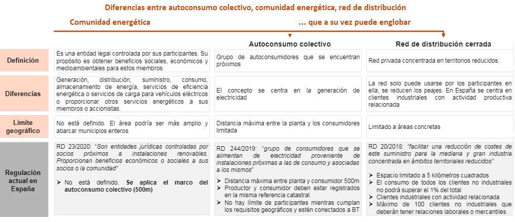 Las comunidades energéticas se diferencian del autoconsumo colectivo en que sus miembros deben formar parte de una entidad jurídica. La comunidad energética es un concepto. Y dentro de ese concepto encajan dos figuras jurídicas: las comunidades ciudadanas de energía y las comunidades de energías renovables, dos figuras jurídicas que vienen del derecho europeo y que los estados miembros tienen que trasponer y desarrollar. Las directivas europeas que recogen esas dos figuras ordenan además, explícitamente, que las trasposiciones doten a estas comunidades de un marco jurídico favorable. ACIE considera indispensable la existencia de un promotor profesional de las comunidades energéticas, "entendido como un agente externo a la comunidad energética y conocedor del sector que ofrezca un catálogo de servicios". Ese perfil -considera la Asociación- sería además "una pieza clave en la consecución de la escalabilidad de este tipo de proyectos". Una de las posibilidades enunciada en el informe elaborado por PWC es que "se debería permitir que el promotor pueda participar en el capital social de la comunidad energética".