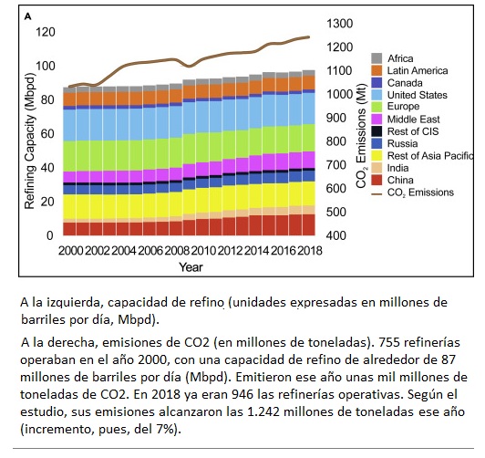 La industria del refinado de petróleo desempeña un papel crucial tanto en la cadena de suministro de energía como en el cambio climático y es el tercer mayor emisor estacionario de gases de efecto invernadero en el mundo, contribuyendo con el 6% de todas las emisiones industriales de gases de efecto invernadero. En concreto, el CO2 representa aproximadamente el 98% de los gases de efecto invernadero emitidos por las refinerías de petróleo. Pues bien, un estudio publicado en la revista One Earth -informa la agencia Europa Press-, ha desarrollado un inventario global (disponible públicamente) de las emisiones de CO2 de 1.056 refinerías de petróleo desde 2000 hasta 2018, y, según los datos recabados, las emisiones de CO2 de la industria de las refinerías fueron de aproximadamente 1,3 gigatoneladas en 2018. Más aún: si todas las refinerías existentes y propuestas funcionan como de costumbre, sin la adopción de ninguna medida de baja emisión de carbono, podrían emitir -estiman los autores- hasta 16,5 gitatoneladas de CO2 de 2020 a 2030. Frente a ello, los autores recomiendan estrategias de mitigación, como la mejora de la eficiencia de las refinerías y la modernización de las tecnologías de procesamiento de petróleo pesado, que -según sus estimaciones- podrían reducir las emisiones acumuladas globales en un 10% de 2020 a 2030.