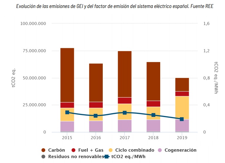 El informe Emisiones de CO2 asociadas a la generación eléctrica en España (REE) establece que las emisiones de gases de efecto invernadero (GEI) a nivel nacional se estiman para el año 2018 en 334,3 millones de toneladas de ceodós equivalente (MtCO2-eq). La generación de electricidad supone el 18% de las emisiones de GEI, frente al 27% del transporte o el 20% de la industria. Estos valores están referidos a CO2-eq, e incluyen tanto las emisiones de CO2, como las del resto de GEI (N2O, CH4 y gases fluorados). En el caso del sistema eléctrico español -explica REE en su informe-, las emisiones se han reducido "como consecuencia de la mayor tasa de energías renovables y la reducción de la producción con carbón", desde los cerca de 80 MtCO2-eq en 2015, a aproximadamente 50 MtCO2-eq en 2019". El factor de emisión ha pasado de 0,29 tCO2-eq/MWh en 2015 a 0,19 tCO2-eq/MWh en 2019 (o sea, -30%).