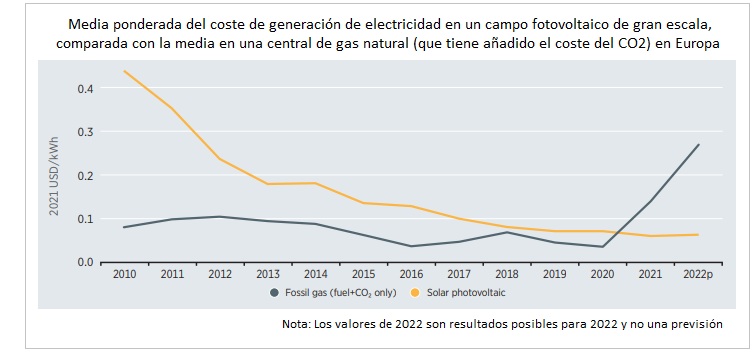 La Agencia considera que los elevados precios tanto del carbón como del gas registrados en 2021 y 2022 van a deteriorar enormemente, ya lo están haciendo, la competitividad de los combustibles fósiles y van a hacer de la eólica y de la solar dos opciones cada vez más atractivas. Irena alerta en su informe por fin sobre la posibilidad de que el encarecimiento sin precedentes que está registrando el gas en Europa acabe convirtiendo la generación de electricidad con gas en el Viejo Continente en algo completamente antieconómico, lo que podría derivar en el varamiento de activos, que quedarían así inutilizados. Más aún: según la Agencia Internacional de las Energías Renovables el caso europeo muestra que tanto los costes del propio combustible (el gas natural) como los del CO2 podrían ser en el caso de las centrales de gas actualmente existentes entre cuatro y seis veces más elevados en 2022 que los costes durante la vida útil de la nueva potencia eólica terrestre y solar instalada en 2021. Entre enero y mayo de 2022, la generación de electricidad eólica y solar -estima Irena- puede haber ahorrado a Europa importaciones de combustibles fósiles, sobre todo de gas, por valor de no menos de 50.000 millones de dólares.