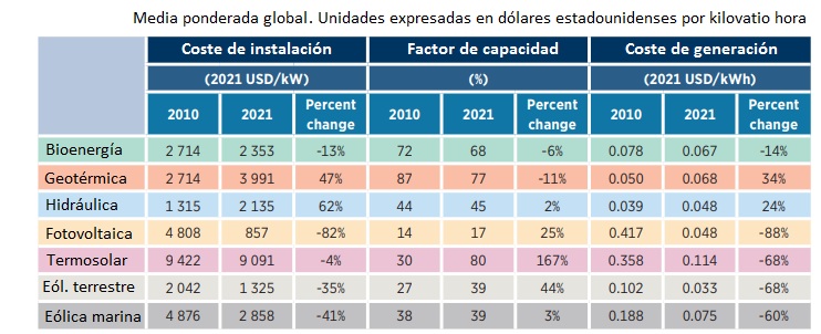 Junto a estas líneas, medias globales con respecto a tres ítems: coste de instalación, factor de capacidad (ojo a los datos) y coste de generación, por tecnologías