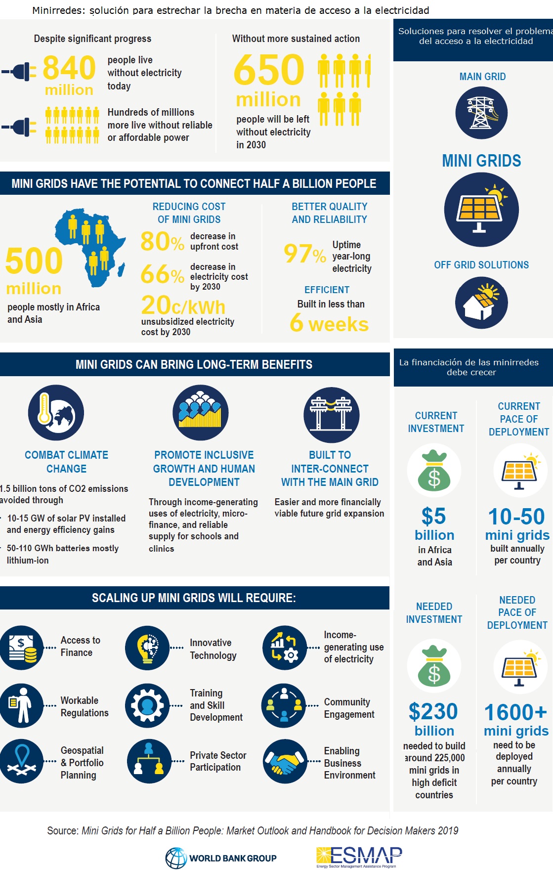 El Banco Mundial (BM) acaba de presentar «Mini Grids for Half a Billion People: Market Outlook and Handbook for Decision Makers» (Minirredes para 500 millones de personas: Perspectivas del mercado y manual para los encargados de tomar decisiones). Según la institución financiera, este es "el estudio más completo sobre minirredes que existe hasta el momento". El objetivo del mismo es proporcionar a los encargados de formular políticas, los inversores y los desarrolladores inmobiliarios distintas ideas sobre cómo pueden ampliarse las minirredes. Además, el informe evalúa el mercado y la industria globales, analiza costos e innovaciones tecnológicas "y demuestra la importancia de las microfinanzas y del uso rentable de la electricidad".