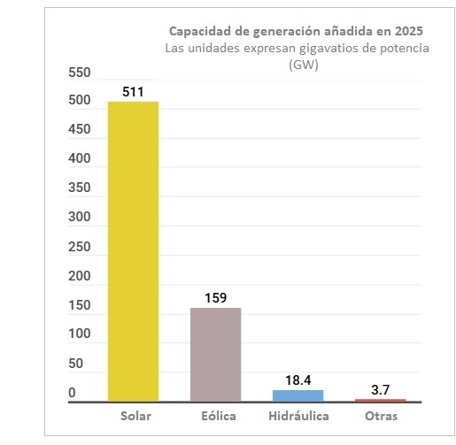 • Energía solar: la energía solar fotovoltaica representó 510,3 GW de los 511,2 GW de adiciones totales de energía solar en 2025.