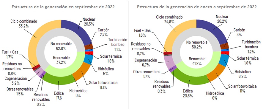 Red Eléctrica de España estima que, en el mes de septiembre, la generación procedente de fuentes de energía renovable ha representado el 37,2% de la producción total española (38,5% si solo tenemos en cuenta la península, donde hay más potencia renovable instalada). El parque eólico nacional ha generado en septiembre 4.186 gigavatios hora (GWh), el 17,6% del total, con un incremento del 29,6% respecto a septiembre de 2021. Mientras, la solar fotovoltaica, con 2.637 GWh anotados en septiembre, incrementó su producción un 37,3% respecto a la del año pasado, alcanzado una cuota del 11,1% del total. La generación hidráulica ha descendido un 14,2% con respecto a septiembre de 2021 debido a la ausencia de precipitaciones.