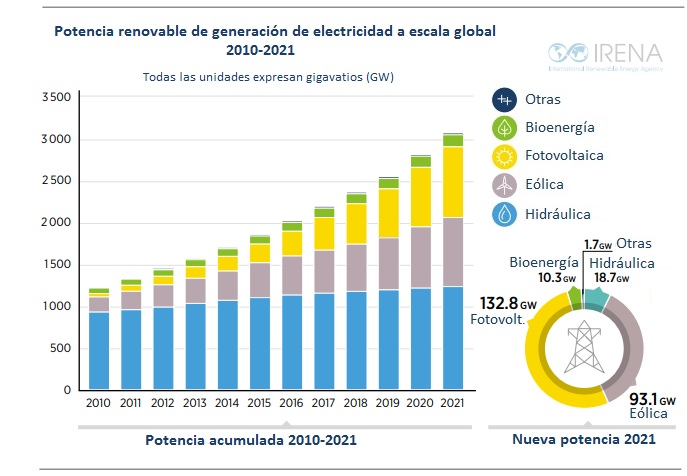 Irena estima (página 46 de su informe) que la solar fotovoltaica y la eólica han empleado en 2021 en España a 31.500 y 23.900 personas, respectivamente, y que esos números pueden continuar al alza. "De acuerdo con algunas proyecciones -dice el informe-, el mercado de las energías renovables podría generar 468.000 puestos de trabajo acumulados a lo largo de la década. Casi la mitad de los trabajos -continúa Irena- podrían ser creados en solo tres comunidades autónomas: Andalucía, Castilla y León y Aragón".