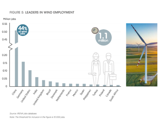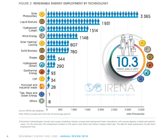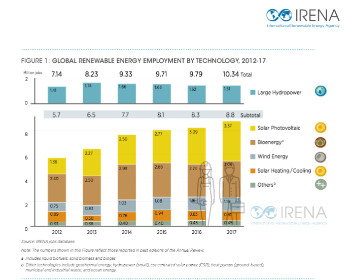 En 2017 había 10,3 millones de personas trabajando en el cada vez mayor sector de las energías renovables, un 5,3% más que en 2016, de acuerdo con el estudio de Irena. China, Brasil, Estados Unidos, India, Alemania y Japón se mantienen como los mayores empleadores, acaparando más del 70% de los puestos de trabajo (casi las 4/5 partes de ellos en Asia). Otro dato destacado por Irena es que si bien cada vez más países obtienen beneficios socioeconómicos de las energías renovables, la mayor parte de la manufactura se realiza aún en unos pocos.
