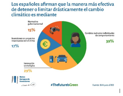 La encuesta pone también de relieve que los españoles son escépticos ante la capacidad de su Gobierno para luchar contra el calentamiento global. Una amplia mayoría (83 %) cree estar más preocupada por la emergencia climática que su propio Gobierno (ocho puntos más que la media europea del 75 %). Afirman que las medidas vigentes son demasiado flexibles, por lo que los particulares y las empresas no se ven obligados a cambiar sus comportamientos y prácticas. Por ello, el 58 % de los ciudadanos españoles cree que España no conseguirá reducir drásticamente sus emisiones de carbono para 2050, como se comprometió en los Acuerdos de París.