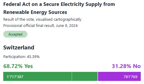 Mientras la UE votaba ayer la composición del Parlamento Europeo 2024-2029, la mayoría de los suizos (68,72%) dieron el visto bueno en las urnas a la legislación federal -apoyada por los partidos de todas las orientaciones- que prepara el terreno para que Suiza produzca más electricidad a partir de fuentes de energía renovables como el agua, el sol, el viento y la biomasa, para consolidar la independencia de su suministro eléctrico y reducir la dependencia del petróleo y el gas extranjeros.