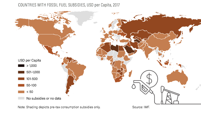Desde 2015, alrededor de 40 países han emprendido algún tipo de reforma en los subsidios a los combustibles fósiles, pero estos subsidios continuaban existiendo en más de 112 países en 2017, y al menos 73 países proporcionaron subsidios de más de 100 millones de dólares cada uno. El total estimado de subsidios destinados a los combustibles fósiles a nivel global fue de 300.000 millones de dólares en 2017, lo que revela un aumento del 11% con respecto a 2016.