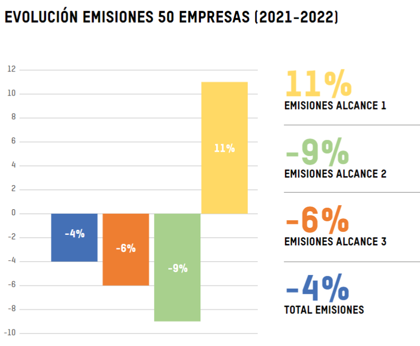 En concreto, IAG (23%) es la que más emisiones directas produce, seguida de Repsol (17%) y Naturgy (16%). En total, las diez empresas que más emisiones de alcance 1 producen son responsables del 97 % del total, en contraste con las empresas del sector financiero y tecnológico, cuyas emisiones directas apenas pesan. Las empresas de petróleo y energía aportan el 65 % del total de emisiones de alcance 1, siendo el tercer sector con mayor peso el de Industria y Construcción, con un 10 %.