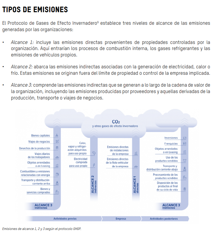 Un elemento clave del análisis es el tipo de emisiones analizadas por su tipo de alcance. El 14 % son emisiones directas por operaciones controladas por la empresa (lo que se denomina alcance 1), mientras que las emisiones indirectas por generación de energía (alcance 2) apenas llegan al 2 %. El porcentaje más alto de emisión (84 %) proviene de las emisiones que se producen a lo largo de la cadena de valor de cada empresa en operaciones sobre las que no tienen un control directo (alcance 3).