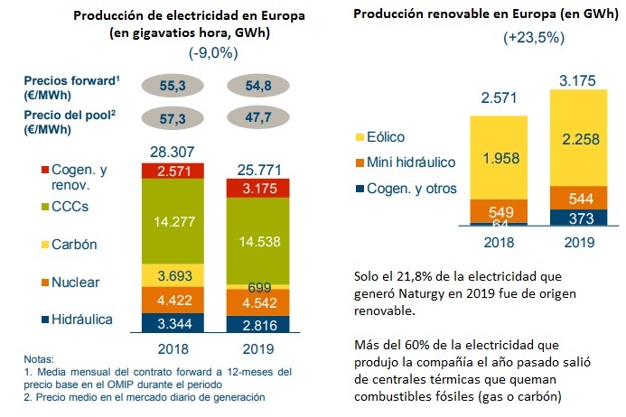 La compañía antes denominada Gas Natural Fenosa ha declarado en 2019 “un beneficio neto ordinario de 1.432 millones de euros, un 15% más que en el ejercicio 2018, mientras que su ebitda ordinario se situó en 4.668 millones de euros (+6%)”. Durante ese ejercicio, Naturgy ha ejecutado inversiones por valor de 1.700 millones de euros: más de 500 millones, en proyectos de energías renovables; otro tanto en redes de distribución (de gas y de electricidad); y el resto, en otras áreas (por ejemplo, durante 2019 Naturgy ha cerrado la adquisición del 34,05% de Medgaz, la compañía que gestiona el gasoducto que une Argelia con España). En todo caso, la empresa ha reducido sus inversiones 2019 en un 27% con respecto a lo invertido en 2018.