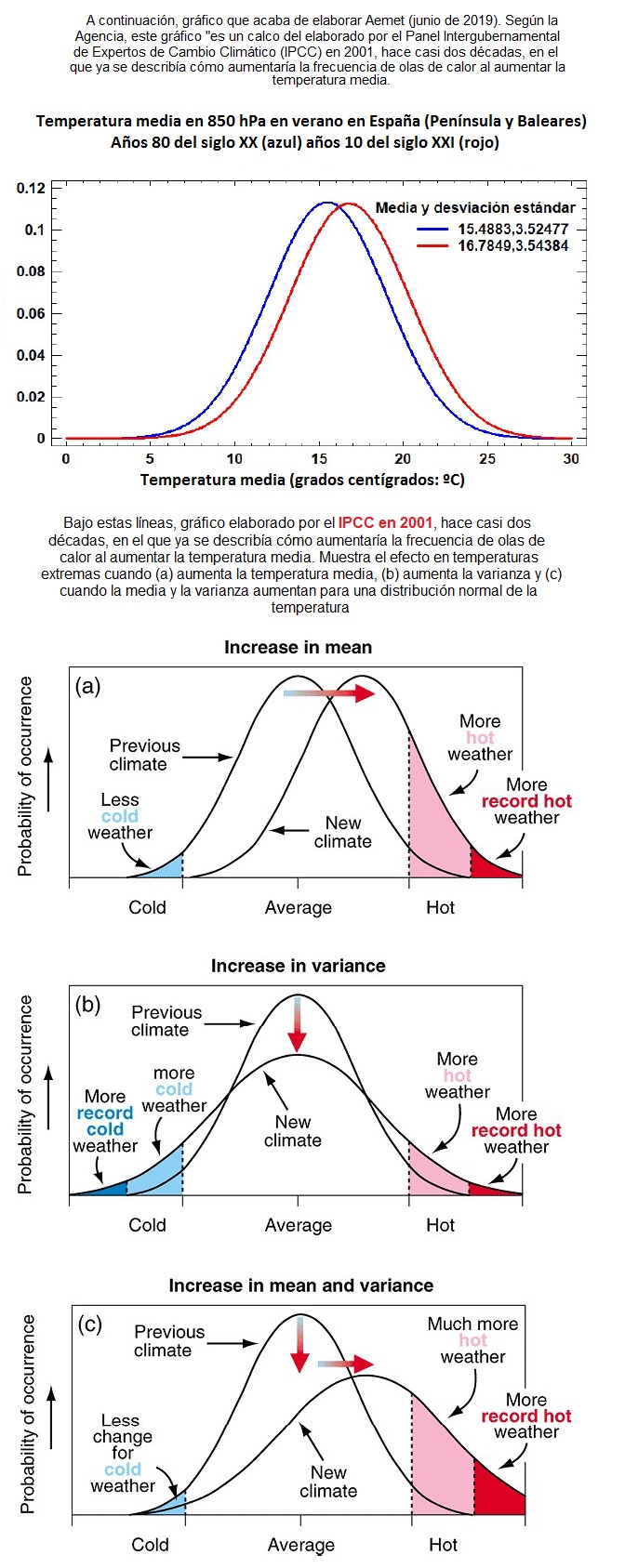 Este cambio en la media de temperatura puede visualizarse mediante un gráfico en el que se han incluido los valores de temperatura media en cada una de las dos décadas y la desviación estándar. Su resultado es un calco del elaborado por el Panel Intergubernamental de Expertos de Cambio Climático (IPCC) en 2001, hace casi dos décadas, en el que ya se describía cómo aumentaría la frecuencia de olas de calor al aumentar la temperatura media (véase gráfico a la izquierda.
