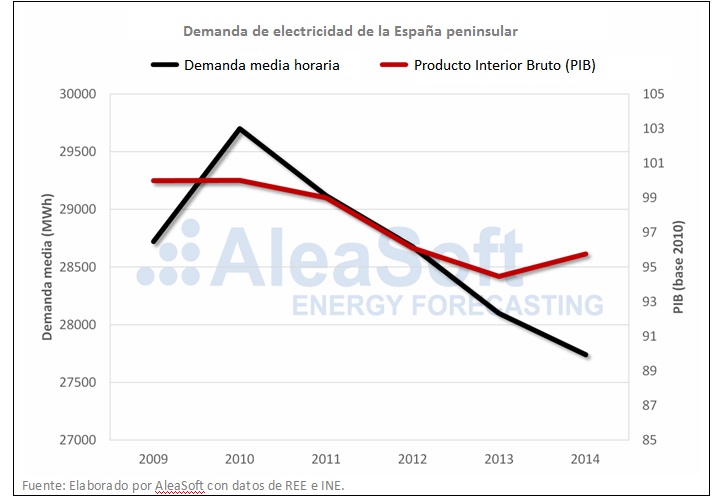 Con la llegada de la crisis económica, la demanda eléctrica de España peninsular paró la tendencia de crecimiento que había mantenido desde que comenzó el mercado eléctrico en 1998 y comenzó a decrecer desde el último trimestre de 2008, de forma similar a la tendencia mantenida por el PIB en este período. Entre los años 2009 y 2013 el PIB bajó cada año excepto en el año 2010 cuando fue similar al de 2009, produciéndose la caída más pronunciada en 2008, de un 3,6%. De forma análoga, la demanda eléctrica disminuyó cada año entre 2009 y 2013, con la excepción del año 2010, en que creció un 3,1%. El año de mayor descenso de la demanda en el período fue 2009, con un 4,7%, siendo esta la mayor caída desde que comenzó a funcionar el mercado y hasta el año 2018. En el año 2014, el PIB comienza a recuperarse, con un crecimiento de un 1,4%, pero la demanda eléctrica continúa bajando, en este caso un 1,1%. Pues bien, según AleaSoft, "una de las razones de este comportamiento es que después de la crisis aumentó la eficiencia energética, algo que ya hemos comentado y en lo que profundizaremos en el próximo artículo". La demanda eléctrica y el PIB de 2014 decrecieron un 8,3% y un 7,6% respectivamente, con respecto al año 2008.