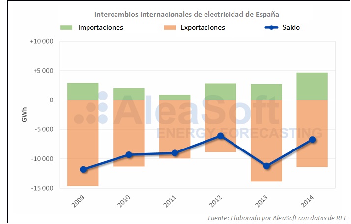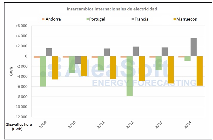Durante el período 2009-2014, los intercambios internacionales de energía del sistema eléctrico de España peninsular se caracterizaron por ser netamente exportadores, es decir, que España vendió a sus vecinos (Marruecos, Portugal, Andorra y Francia) más electricidad que la que les compró. Según AleaSoft, "este comportamiento exportador en los intercambios tuvo su explicación en el aumento del volumen exportador hacia Marruecos, que superó al volumen de intercambios entre España y Francia durante todo el período". Los volúmenes de exportación hacia Portugal fueron también altos durante este período, aunque desde el año 2012 este volumen fue disminuyendo hasta caer al 9% del total de intercambios en el año 2014. En agosto de 2012 se puso en funcionamiento el enlace submarino de transporte de energía eléctrica entre la península y la isla de Mallorca. El intercambio entre el continente y el archipiélago fue netamente exportador durante este período y, desde su puesta en funcionamiento, fue aumentando gradualmente hasta alcanzar el volumen máximo de exportaciones en el último de los ejercicios de la serie aquí analizada: 2014.
