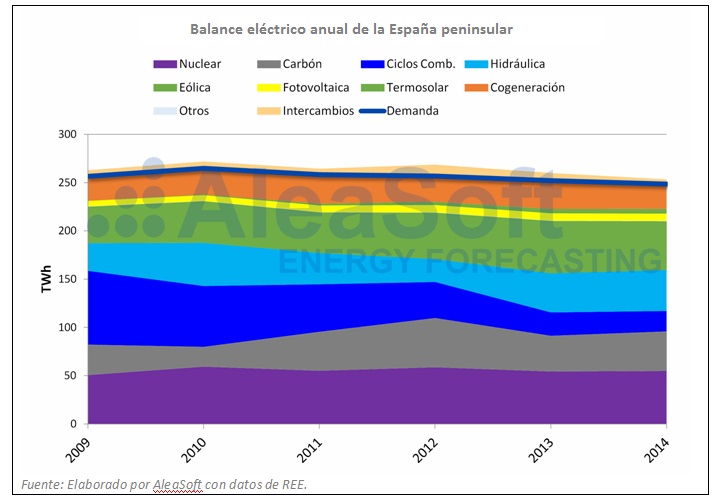 AleaSoft destaca varios "datos relevantes": (1) la caída abrupta de la producción con ciclos combinados, que en tres años pasó de ser la principal fuente de generación de electricidad a ser la sexta, solo por encima de la aún incipiente producción solar (la empresa experta en previsiones considera que el descenso de la producción de electricidad con ciclos combinados se debe "en parte a la reducción del hueco térmico por la disminución de la demanda y al aumento de la producción con energías renovables" y en parte a "la subida del precio del gas, que hizo más competitivo al carbón" (además, el precio de las emisiones de CO2 también cayó durante este período). Por otra parte, desde 2011 la generación con fuel más gas dejó de participar en el mix "peninsular" español. Durante este período la nuclear fue la principal fuente a la hora de satisfacer la demanda nacional y la caída de la producción con ciclos combinados cedió el segundo puesto a la eólica.