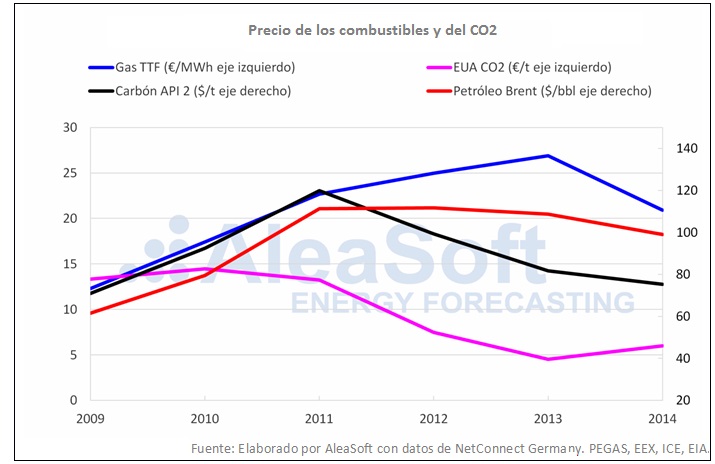 El gas TTF inició el período 09-14 con un precio promedio anual de 12,28 €/MWh, un 49% inferior al del 2008, siendo el año 2009 el de menor precio en este período. A partir del año 2010, el precio subió de manera continuada hasta alcanzar su valor máximo para este período, de 26,88 €/MWh, en el año 2013. En el año 2014, el comportamiento de los precios cambió, y el valor promedio fue 20,91 €/MWh, un 22% inferior al del año anterior y tan solo un 0,3% superior a la media de este período, de 20,85 €/MWh. El carbón API 2 (al igual que el Brent y el gas) inició el período 2009-2014 con una importante bajada de precios. El valor promedio para el año 2009, de 70,96 dólares la tonelada ($/t), fue un 51% inferior al valor correspondiente al año 2008, de 144,15 $/t. Los años siguientes, los precios volvieron a aumentar, pero la tendencia al alza finalizó antes que para el Brent y el gas. En el año 2011 se alcanzó el precio promedio anual máximo del período analizado, de 119,92 $/t. Posteriormente, los precios empezaron a disminuir y esta tendencia se mantuvo hasta el año 2014, cuando el precio promedio anual fue de 75,35 $/t, un 16% inferior al promedio del período analizado, de 89,93 $/t.