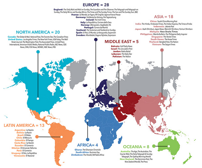 La muestra total incluyó 37.670 artículos de noticias, publicados entre 2011 y 2015, de 84 publicaciones (generalmente periódicos) en cuatro idiomas (inglés, francés, español y portugués). Luego, los investigadores clasificaron el encuadre de cada uno de los artículos, asignando cada uno de los siete marcos: Impacto económico, Política nacional / Impacto normativo, Evidencia científica, Progreso social, Energía, Relaciones internacionales e Impacto natural.