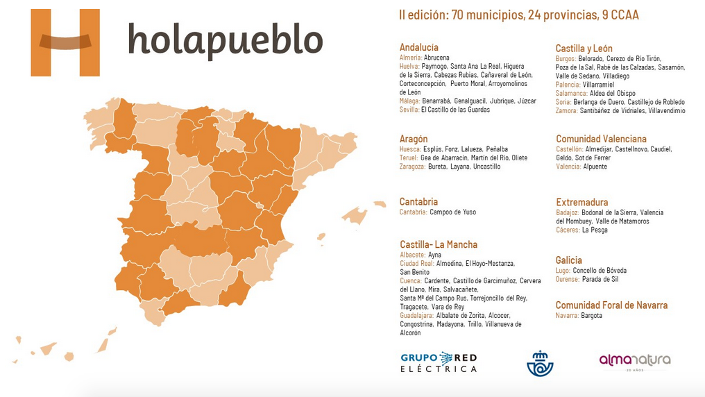 Los municipios de esta segunda edición se encuentran en Andalucía, Aragón, Cantabria, Castilla- La Mancha, Castilla y León, Comunidad Valenciana, Extremadura, Galicia y Navarra, y pueden consultarse en la web holapueblo.com. Todos ellos reúnen los requisitos más importantes de quienes desean vivir y emprender en el medio rural, como disponer de buena conectividad a internet, oferta de vivienda, consultorio médico y centro educativo, entre otros.