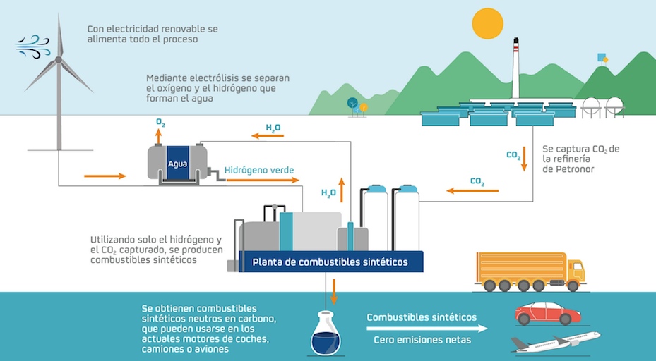 Los socios de Repsol en esta iniciativa son Petronor (empresa del grupo Repsol) y el Ente Vasco de la Energía (EVE), que es un organismo dependiente del Gobierno vasco. La fábrica de combustibles sintéticos de Repsol, que la petrolera asegura que estará totalmente operativa en 4 años, quiere convertirse en "referencia en Europa por la tecnología puntera aplicada y por el uso del CO2 capturado en la cercana refinería de Petronor". Su desarrollo -explica Repsol- supone "un reto tecnológico de primer orden que estará liderado por el centro de investigación Repsol Technology Lab". La fabricación combinará el hidrógeno verde −energía 100% limpia al ser generada a partir de fuentes renovables− con el CO2 como materia prima en el proceso, "y situará a Repsol a la vanguardia del desarrollo de los combustibles de cero emisiones netas".