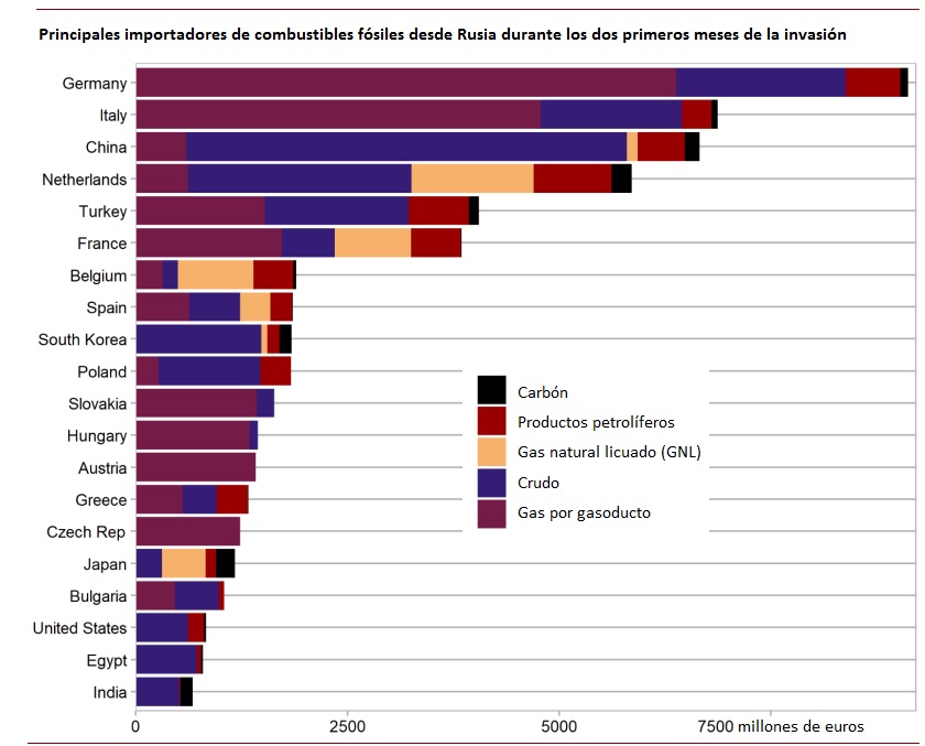Desde el pasado de 24 febrero, la Unión Europea ha importado desde Rusia productos energéticos por valor de alrededor de 44.000 millones de euros. La tabla de principales importadores la encabeza Alemania, que importó como se dijo 9.100 millones. A continuación le siguen Italia, 6.900 millones; China, 6.700 millones; Países Bajos, 5.900 millones; Turquía, 4.100 millones y Francia 3.800 millones de euros.