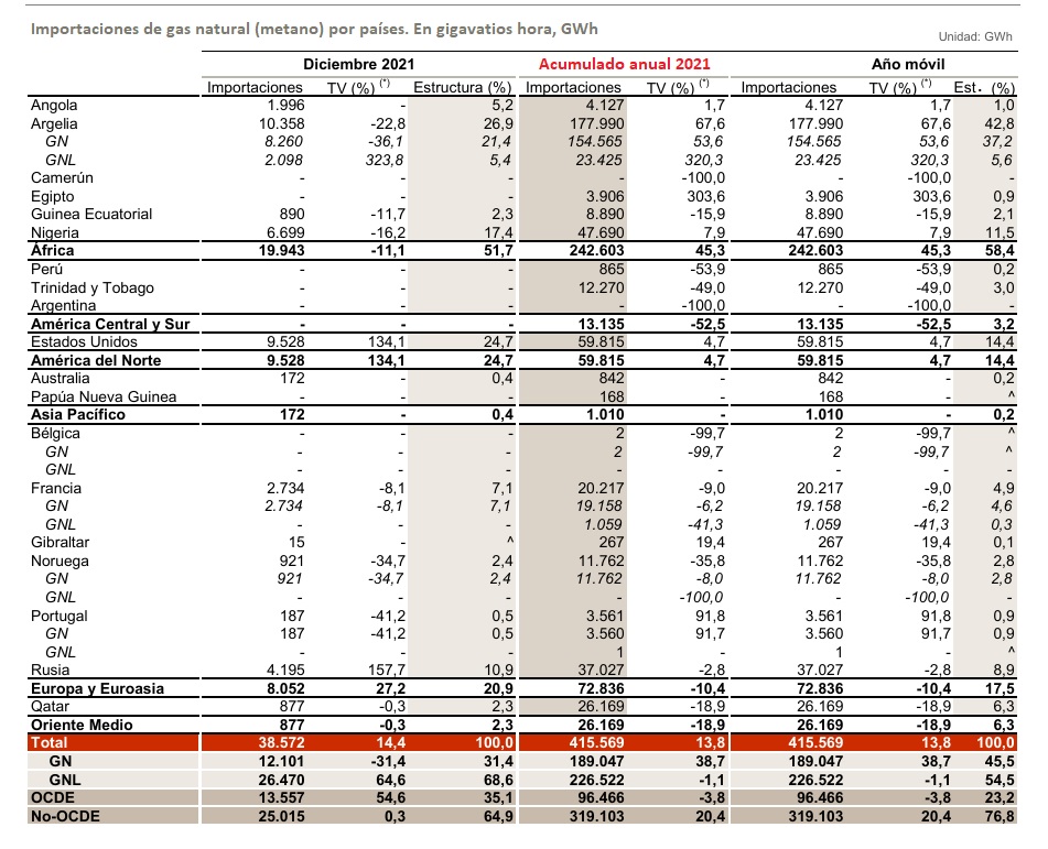 [Bajo estas líneas, relación de las naciones que suministraron en 2021, antes de la guerra Ucrania-Rusia, gas natural a las compañías energéticas que operan en España. Fuente: Corporación de Reservas Estratégicas de Productos Petrolíferos, Cores, entidad dependiente del Ministerio para la Transición Ecológica y el Reto Demográfico].