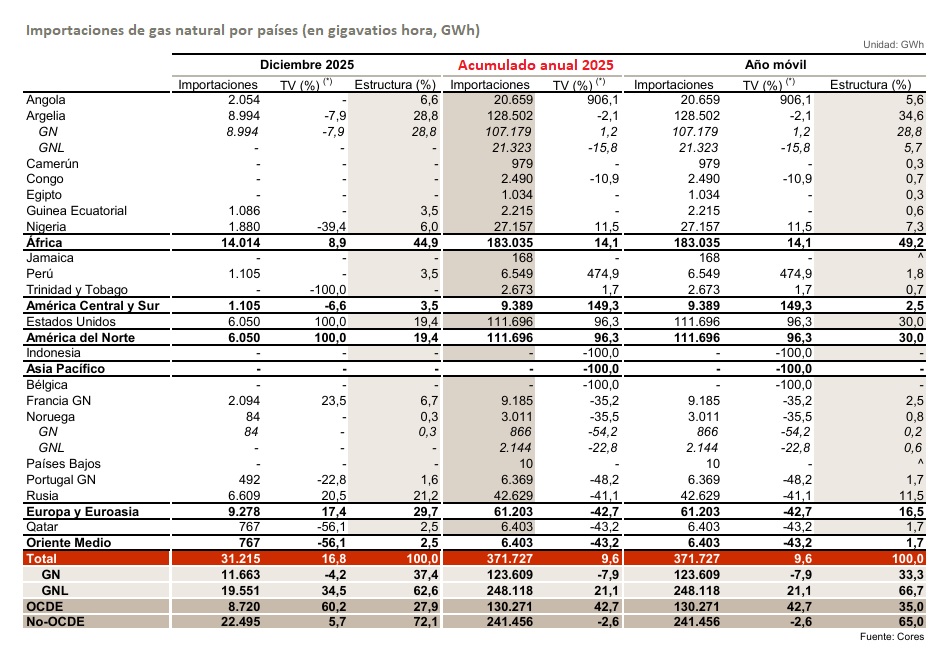 España ha importado 371.727 gigavatios hora de gas natural (metano) en los doce meses de 2025. Los tres principales proveedores de las empresas energéticas que queman gas en nuestro país (para producir electricidad o calor) han sido Argelia (128.502 gigavatios hora), Estados Unidos (111.696 GWh) y Rusia (42.629). Tras ellas, solo Nigeria supera los diez mil gigavatios hora (27.157). Además de estas cuatro naciones, las compañías energéticas que operan con gas en España (Iberdrola, Endesa, Naturgy, EDP, Moeve, Repsol, etcétera) adquieren ese gas a otros doce países. Es decir, que el suministro de gas está diversificado, según el Gobierno.