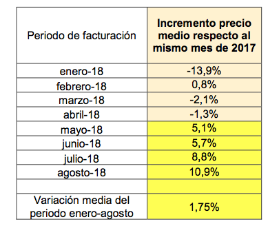 En la siguiente tabla se recogen las variaciones de precio de facturación con respecto al año anterior, y la variación media entre los meses de enero y agosto de este año (1,75%).