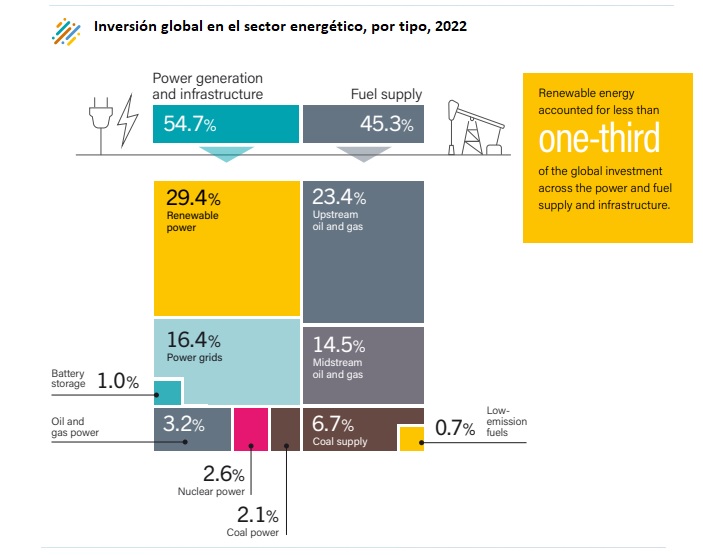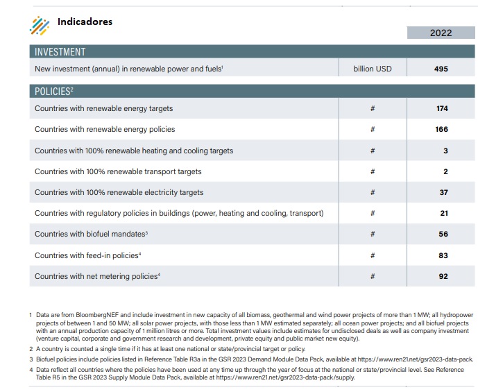 Aunque las economías emergentes y en desarrollo representan dos tercios de la población mundial, estas -concreta REN21- solo recibieron una quinta parte de la inversión mundial en energías renovables en 2022. A pesar de los numerosos desafíos sociales, económicos y geopolíticos a nivel mundial, la inversión en energías renovables alcanzó un récord de 495.400 millones de dólares estadounidenses en el año 2022, pero esta cifra sigue palideciendo en comparación con los 1,1 billones de dólares estadounidenses invertidos en combustibles fósiles. En 2021, los bancos privados destinaron 395.000 millones de dólares a proyectos de combustibles fósiles y sólo 53.000 millones a energías renovables.